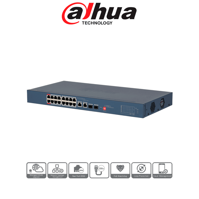 DAHUA DH-CS4218-16ET-240-V2 - Switch PoE Administrable de 18 Puertos / 16 Puertos PoE/ 240 Watts Totales/ Interfaz Web/ Puerto 1 y 2 Soportan 90 Watts/ 2 Puertos SFP/ 2 Puertos Uplink/ Administrable Cloud Dolink Care/ PoE Watchdog/ Switching 8.8 Gbps/