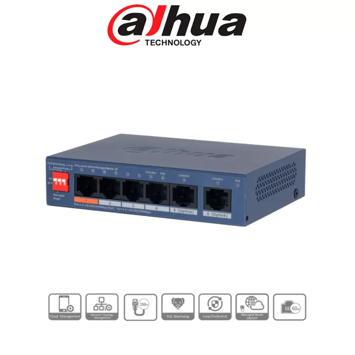 DAHUA DH-CS4006-4GT-60-V2- Switch PoE de 6 Puertos Gigabit/ 4 Puertos PoE 10/100/1000/ 2 Puertos Uplink 10/100/1000/ 60 Watts Totales/ Administrable en la Nube por DoLynk Care/ PoE Hasta 250 Metros/ Carcasa Metalica/ Switching 12 Gbps