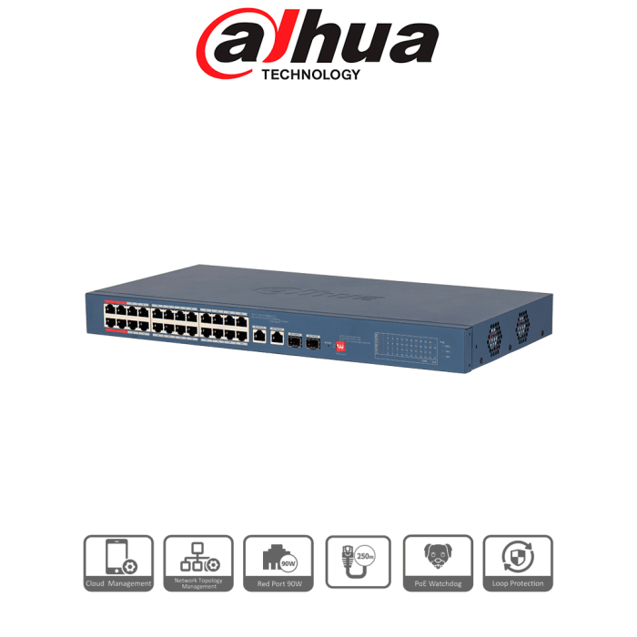 DAHUA DH-CS4226-24ET-240-V2 - Switch PoE de 26 Puertos/ 24 Puertos PoE 10 & 100/ 2Ptos Uplink GE + 2 Puertos SFP/ 2 Ptos PoE de Hasta 90W/ 240 Watts Totales/ Administrable en la Nube por DoLynk Care/ PoE Hasta 250 Metros/ Metal/ Switching 8.8 Gbps