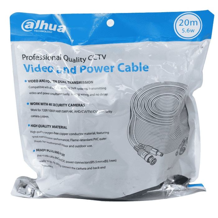 DAHUA DH-PFM942I-20-5 - Cable de 20 Metros Armado para Video y Energía/ Para Camaras Hasta 4k/ con Conectores BNC y de Energía/ Uso Exterior e Interior/ Cobre de Alta Pureza/ Soporta: AHD/CVI/TVI/CVBS/