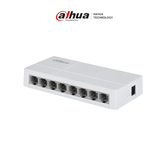 DAHUA DH-SF1008L - Switch de Escritorio con 8 puertos Fast Ethernet (10/100 Mbps), diseño compacto de capa 2, con capacidad de switching de 1.6 Gbps y velocidad de reenvío de paquetes de 1.19 Mpps. Ideal para redes eficientes y compactas.