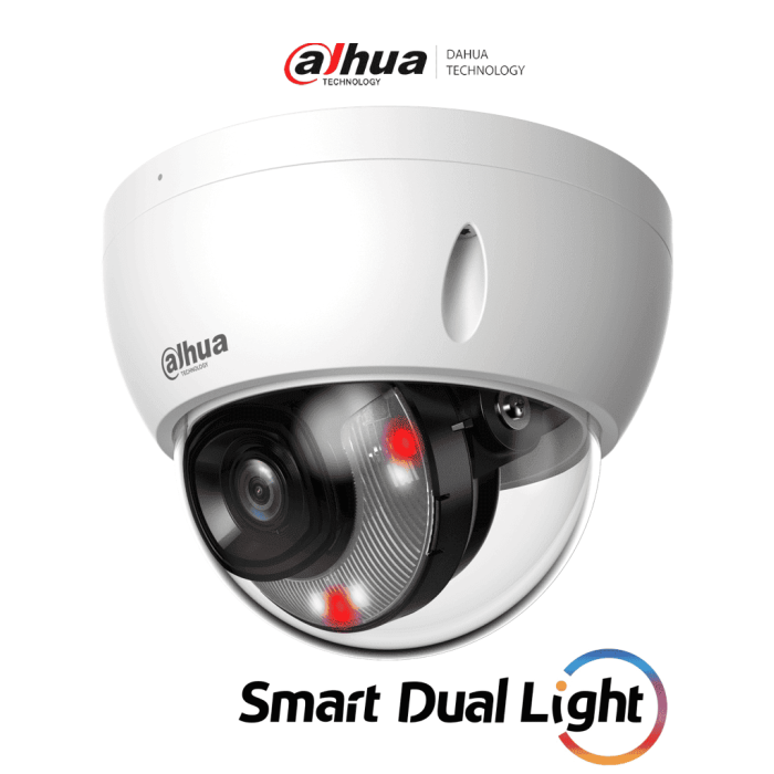 La DAHUA IPC-HDBW2449E-S-IL es una cámara IP tipo eyeball de alta resolución (4 MP, 2688 × 1520) equipada con lente de 2.8 mm que ofrece un ángulo de visión de aproximadamente 101°. Utiliza la tecnología de iluminación dual inteligente (LED IR + luz blanca) con un alcance de hasta 30 m, permitiendo grabación a color en condiciones nocturnas cuando se detecta movimiento. Cuenta con el módulo WizSense para protección perimetral (tripwire, intrusión) y detección inteligente de personas/vehículos (SMD Plus). Además, posee ranura para microSD (hasta 256 GB), micrófono incorporado, PoE, y resistente al entorno con índices IP67 e IK10