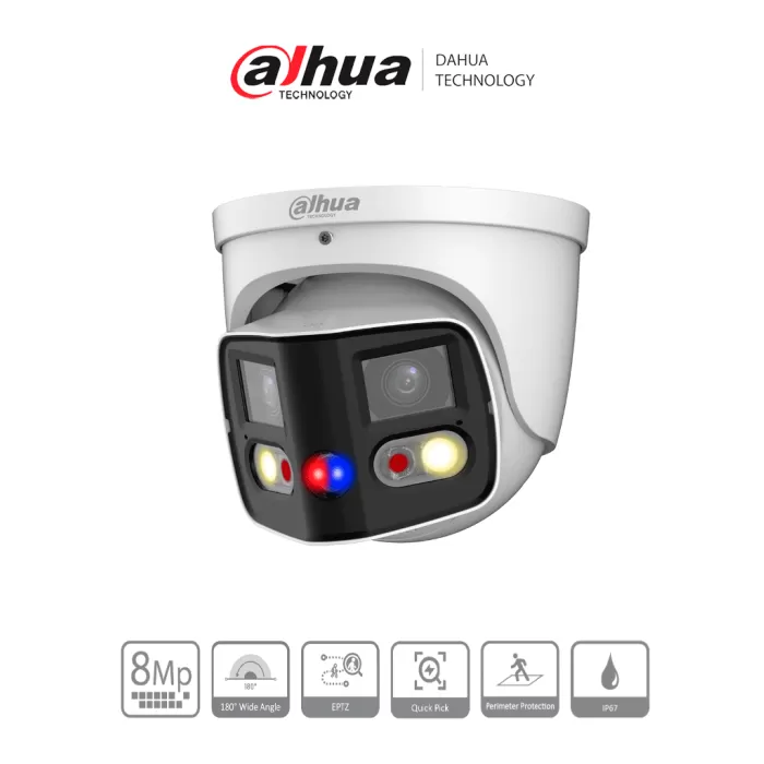 DAHUA IPC-PDW3849-A180-AS-PV Cámara IP WizSense Eyeball con multivisión en dos sensores de 4MP, ofreciendo un ángulo de 180°. Con IR de 25 m, LED de 20 m, disuasión activa, ePTZ, micrófono, altavoz, y protección IP67.