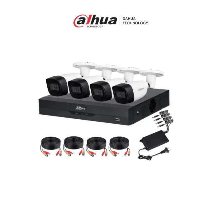 DAHUA KITXVR5104HS4KLI3+4HFW1500CMA- Kit de vigilancia de 4 canales 5 MP con audio y DVR WizSense con reconocimiento facial y H.265+. Soporta 4 canales + 4 IP o hasta 8 IP. Incluye 4 canales SMD Plus para búsqueda de humanos y vehículos