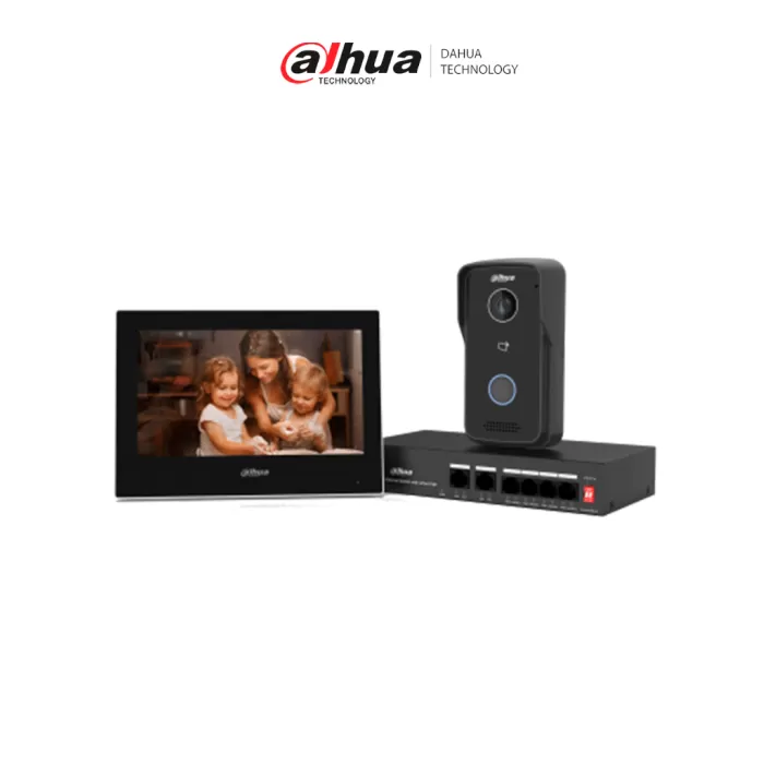 DAHUA KTP03-V2 - Kit de Videportero IP/ Monitor de 7 Pulgadas. Frente de Calle y Switch PoE/ 6&1 E&S de Alarma/ Frente de Calle IP65/ IR/ Apertura Remota / Switch de 4 Puertos PoE 10/100/ 2 Puertos Uplink/ Controla 1 Puerta