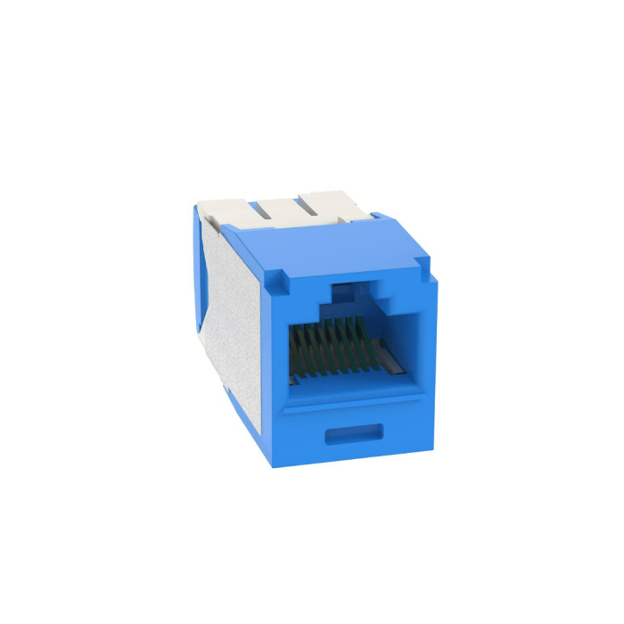 El Módulo Jack UTP 10Gig TX6A™ Mini-Com® de 8 posiciones y Categoría 6A/Clase EA permite la terminación de cables UTP de 4 pares, sin blindaje, de calibre 22 a 26 AWG, sin necesidad de herramientas de impacto. Codificado con color azul para su desempeño en Categoría 6A, incluye una etiqueta universal para los esquemas de cableado T568A y T568B. Este módulo es ideal para el sistema de cableado de cobre de 10Gig TX6A™, compatible con transmisión 10GBASE-T.