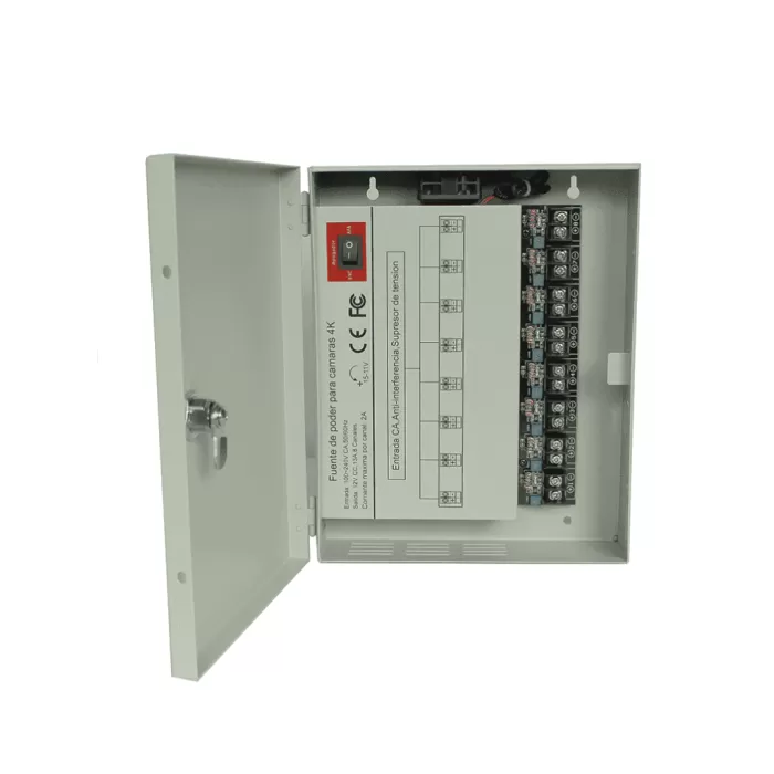 Ésta fuente de alimentación de 110 VAC, le entregará 12 VCD, 10 Amp. de salida para la alimentación de sus cámaras. Cuenta con distribuidor de voltaje para 8 cámaras con protección de resistencias en cada canal, led indicador de funcionamiento y un sistema de reducción de ruido.