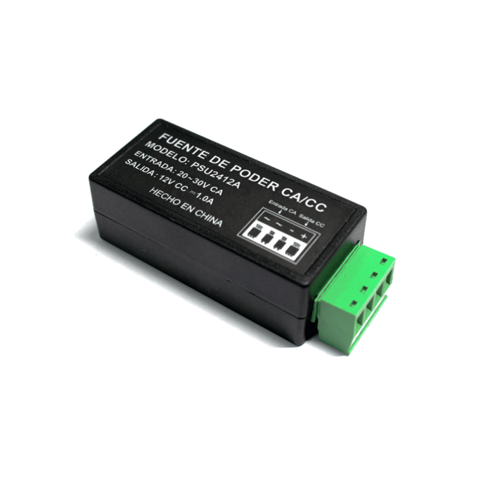 El convertidor de corriente alterna a continua Saxxon modelo PSU2412A, nos sirve para poder llevar la energía a nuestras cámaras cuando se encuentran a larga distancias gracias a que el equipo trabaja con un eliminador que se vende por separado de 24 V CA y al llegar a la camara se coloca este transformador para convertir la corriente a 12 V DC hasta 1000 mA por lo que es capaz de energizar cámaras IR, cámaras PTZ u otros dispositivos que requieren