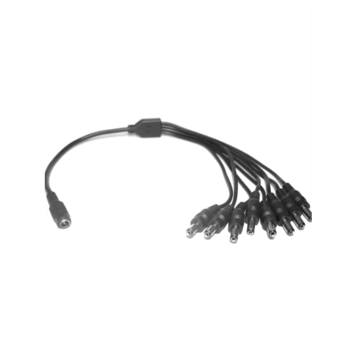 Cable tipo pulpo para suministro y distribución de corriente eléctrica para 8 cámaras de CCTV , desde una sola fuente de energía. Tiene 8 conectores machos de 2.1mm para las cámaras y un conector hembra para la fuente.