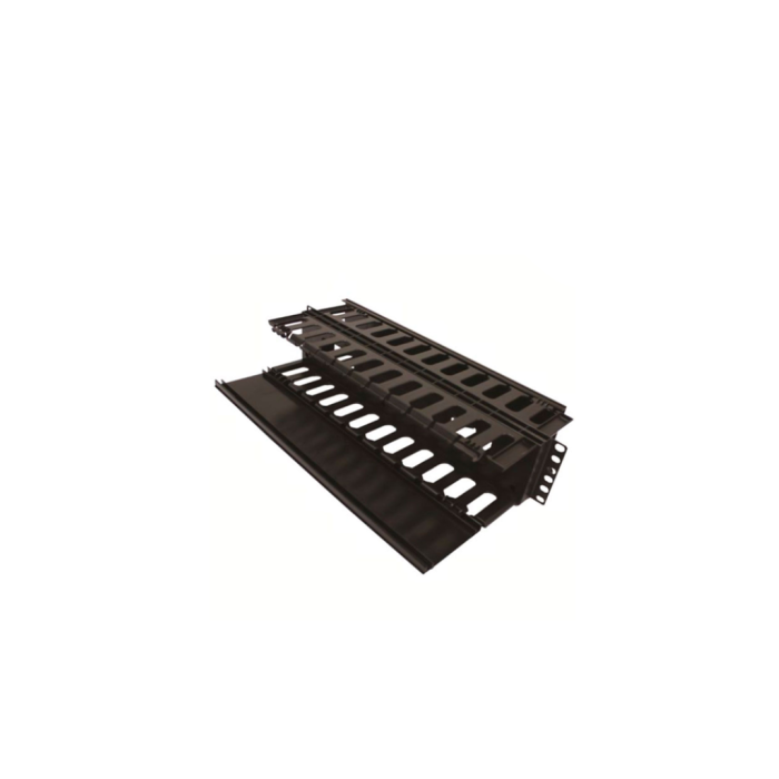 Organizador para cable de 2 unidades de rack de doble lado(enfrente y atrás) para racks de 19", con base metálica en color negro.