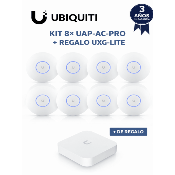 UBIQUITI KIT 8× UAP-AC-PRO + REGALO UXG-LITE – Paquete de 8 puntos de acceso UAP-AC-PRO de doble banda con MU-MIMO y PoE para cobertura Wi-Fi de alta densidad. Incluye de regalo el UXG-Lite para seguridad, routing y gestión centralizada.