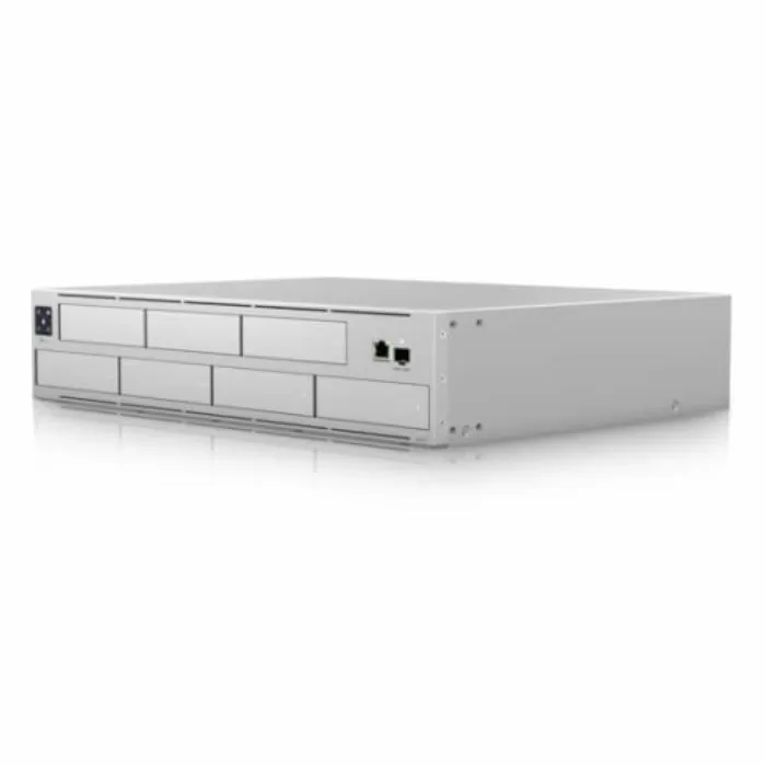 Es un grabador de video en red (NVR) diseñado para gestionar y almacenar grabaciones de cámaras de seguridad, especialmente en sistemas UniFi Protect. Permite conectar hasta 20 cámaras 4K o 60 cámaras 1080p, con un almacenamiento expandible de hasta 56TB a través de 7 bahías de discos duros. Su configuración automática de RAID asegura redundancia y protección de los datos. Ofrece puertos 10G SFP+ y GbE RJ45 para altas velocidades de transferencia, y su pantalla táctil facilita la administración del sistema. Es ideal para instalaciones grandes que requieren alta capacidad de almacenamiento, gestión centralizada y fácil integración con otros dispositivos UniFi.