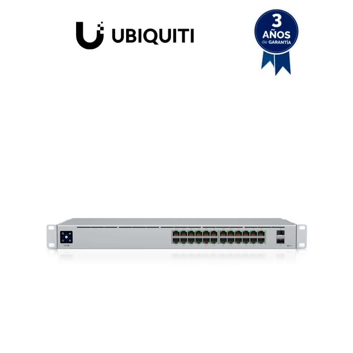 UBIQUITI USW-24-POE UniFi Switch Gen2, Capa 2 de 24 puertos (16 PoE 802.3af/at + 8 Gigabit) + 2 puertos 1G SFP, con 95W de potencia y pantalla informativa.